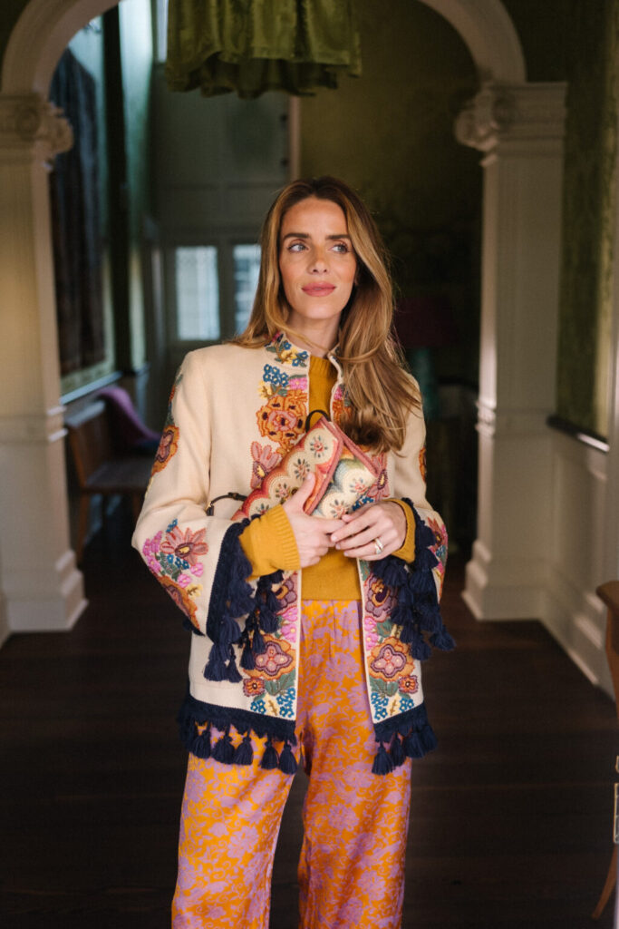 Valentino Garavani Jacket, The Elder Statesman Sweater, Dries Van Noten Pants (old, similar here and here), Valentino Bag Texture, embroidery, fringe, and hand-finished details set the mood, bringing a sense of artistry back into dressing. Beaded jackets, brocade minis, silk twill pants with fringe, and richly patterned blouses lean into craftsmanship, where fabric and finish do