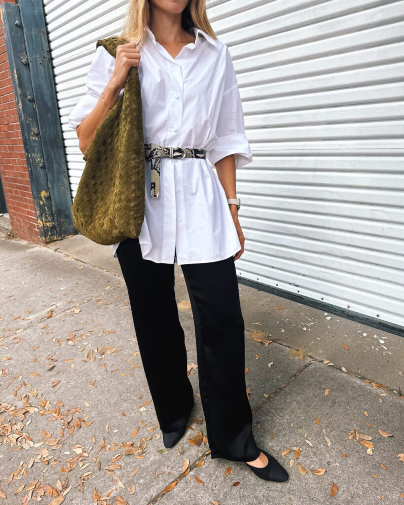 Valentino Shirt (similar less expensive here), Khaite Belt, Leset Pants, Bottega Veneta Bag, Chanel Flats (old, similar, less expensive here and here)