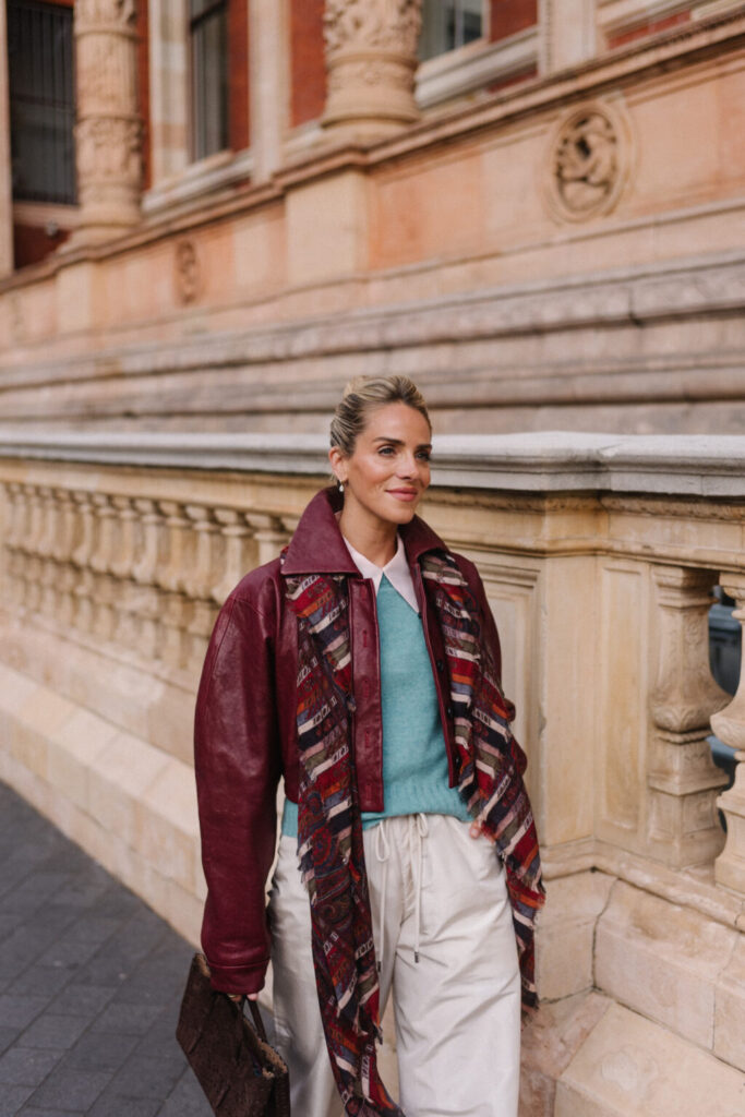 Khaite Jacket (old, similar here), Khaite Shirt (old, similar here), Guest In Residence Sweater, Kallmeyer Pants, Chanel Loafers (similar, less expensive here), Alaia Bag (sold out, similar here), Valentino Scarf (sold out, similar here and here)
