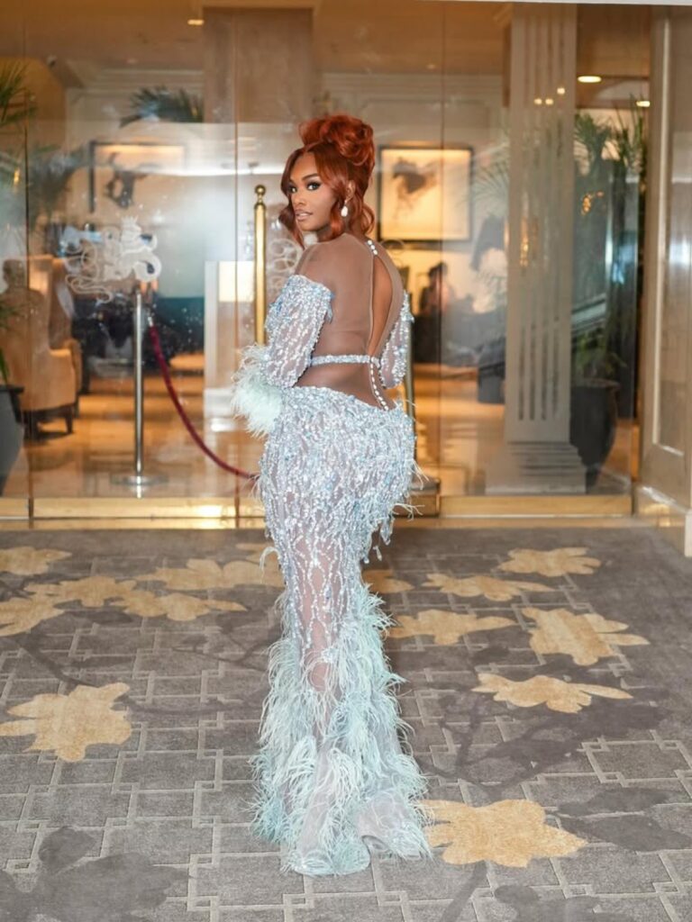 The architect behind this strategic style assault was none other than celebrity stylist @theplugsdaughter. The assignment was precise: craft a look for a champion’s body—a physique built on power and discipline—that screams high fashion, not athletic wear. The mission was accomplished with a show-stopping, sky blue feathered and sequined gown by Valdrin Sahiti. This wasn’t just a dress; it was a statement piece, blending ethereal beauty with undeniable presence.
