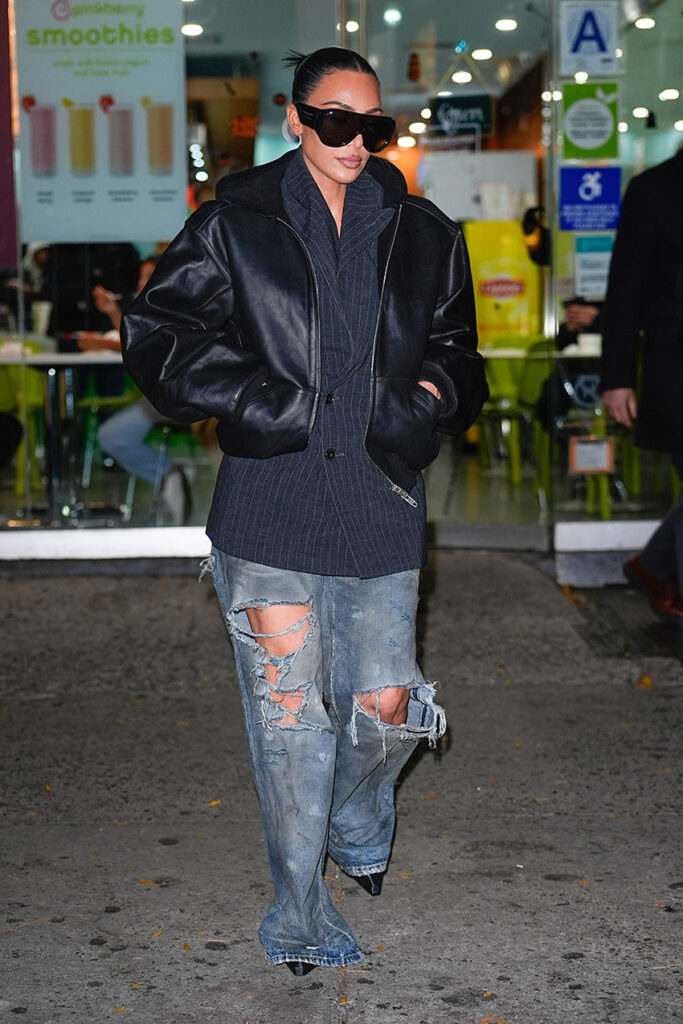 I love a blazer as much as the next fashion person, but it’s usually styled quite simply: over a T-shirt or button-down. This is still chic, of course, but it’s not really a piece that’s styled in any other fresh ways. Until I saw the most contemporary way to style a blazer ever: Layer a leather jacket over it. Kim Kardashian was recently spotted in NYC wearing a sleek pinstripe blazer and a thick black leather bomber jacket layered over it. I was stunned and so intrigued, I’ve never seen such a fresh take on styling a blazer, especially in the fall and winter.