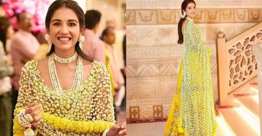Radhika wowed everyone with her exquisite dupatta made of fresh flowers for her haldi ceremony. The floral dupatta perfectly complemented the vibrant yellow lehenga designed by ace designer Anamika Khanna. The intricately woven dupatta featured 90 yellow marigold flowers and thousands of fresh jasmine buds. She paired the outfit with custom-made floral jewellery.