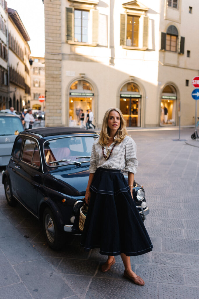 Frame Shirt, Bottega Veneta Skirt, Staud Flats (similar, less expensive here), Delvaux Bag, Prada Necklace