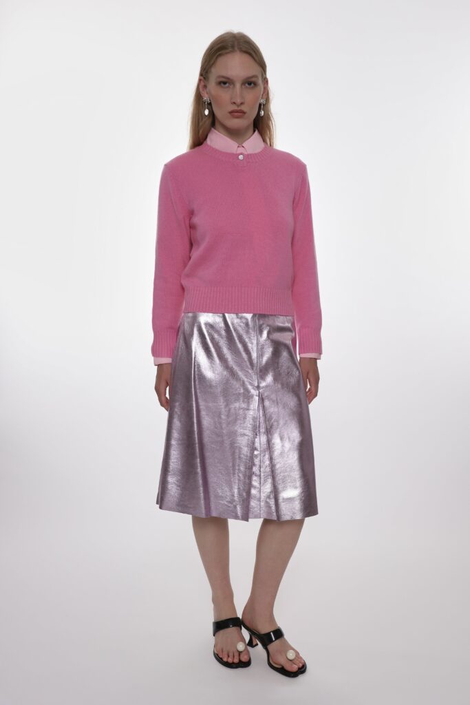 Metallic is not normally a thing I think about when it comes to my fall wardrobe. Instead I’m focused on faux fur or pony hair—textures that feel cozy. But the way Liang had the skirt styled really changed my perspective. The model was wearing open-toed sandals, which I have retired for the season, but also the perfect pink sweater layered over a collared shirt. From the knee up, this was a look I wanted to live in for the rest of the season.