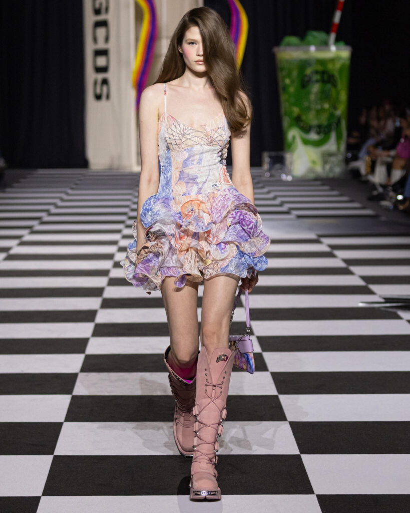 GCDS staged a playful yet provocative runway moment, with models emerging from a towering shopping bag installation as “Teenage Dirtbag” played through the venue. The collection leaned heavily into a retro ’90s mood, pairing lingerie codes with daywear silhouettes and delivering an air of insouciance throughout.
