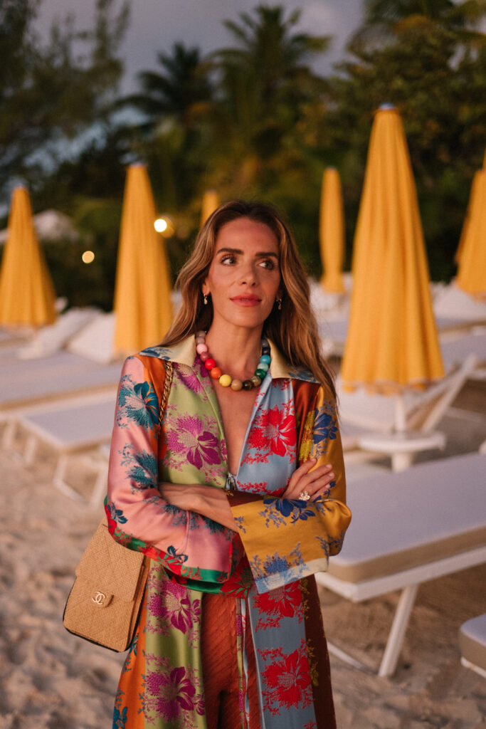 Rosie Assoulin Jacket, Guiliva Heritage Pants, Chanel Bag, Carolina Bucci Necklace