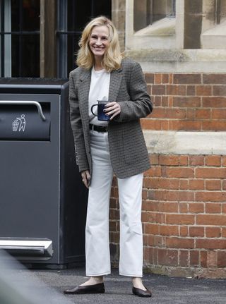 Recently, the romcom queen was spotted enjoying a cup of coffee while on set in London filming the upcoming movie, After the Hunt. Complete with a chic blonde long bob and minimal makeup (but don’t miss the moody dark nail polish!), Roberts proves that some things—like her iconic oversized blazers of the ’90s—only get better with age.