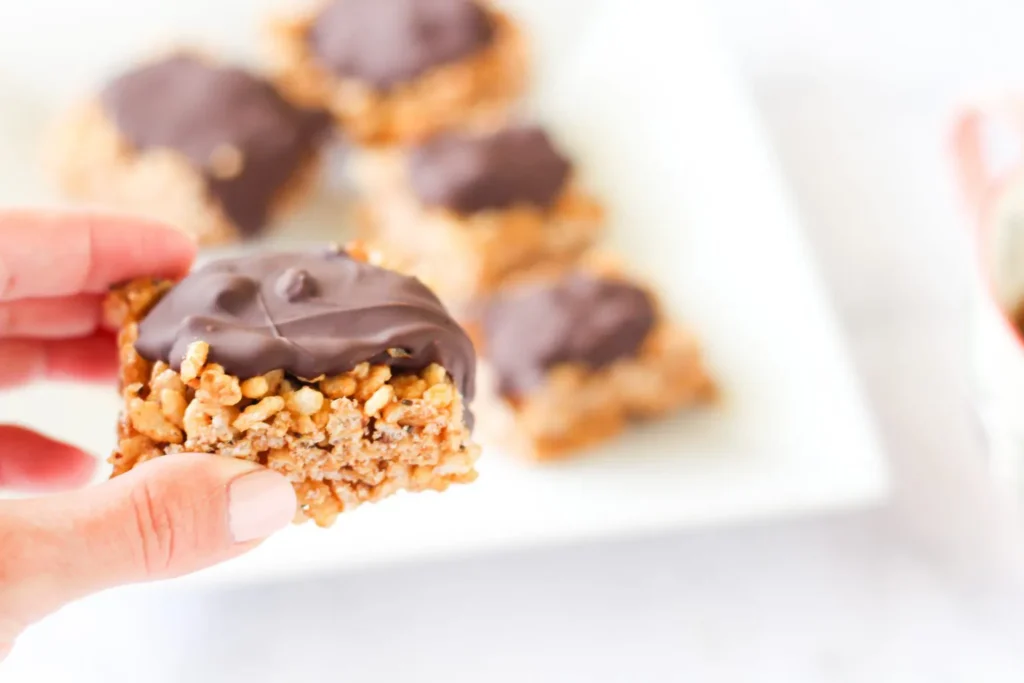 These crunchy almond butter chocolate bars are a quick, healthy, and delicious gluten-free dessert or treat idea. They call for all gluten-free ingredients, only take 10 minutes of active prep, and can be easily tweaked for my vegan friends.