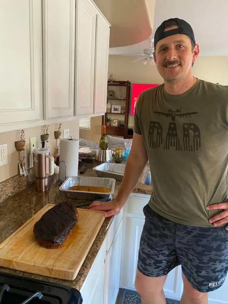 (the brisket king! We had fam over last weekend and made brisket, smoked chicken legs, salad, and my new favorite fruit tart – recipe coming next week)
