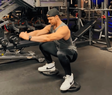Tip: Placing weight plates underneath your heels (like Thurman demonstrates) can help you achieve a deeper squat depth.