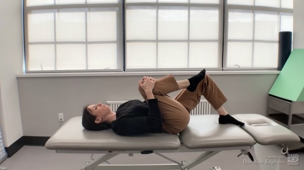 - Lie down on your back with your knees bent and both feet on the floor. Keep your knees and feet as close together as you comfortably can.