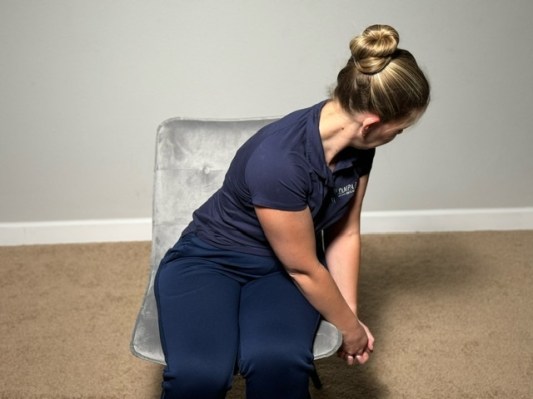- Sit upright in a chair with your hands in your lap and feet flat on the floor.