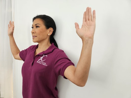 If your shoulders are too tight do this move with your arms all the way back against the wall, Wu says you can try it in what’s called “the scapular plane,” about 30 to 45 degrees forward in front of the wall. “It’s a little bit easier on the shoulder joint,” she says.
